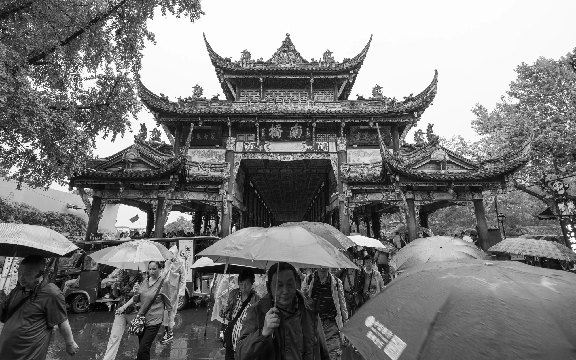 Near the main entrance of the Dujiangyan Scenic Area stands Nanqiao, a covered bridge. My girlfriend and I walked through it in a light rain. Just after we came out on the north side, I got the idea to capture the feeling of being in the crowd—so I turned around and took this shot with an ultra-wide-angle lens.