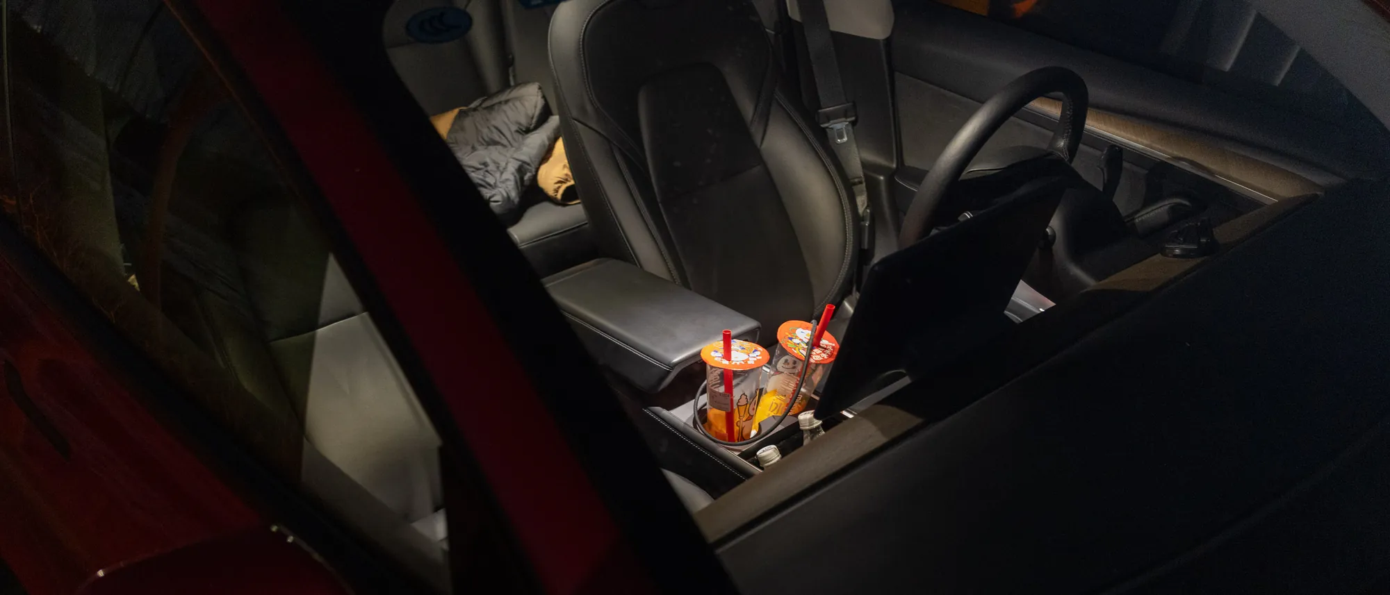 In the winter of 2023-2024, Haotian rented a red Tesla, so he drove us to Qinhuangdao for a trip. This photo was taken when we stopped and got out to rest after taking a wrong turn. The two cups of Mixue lemonade in the car were bought in Tangshan.