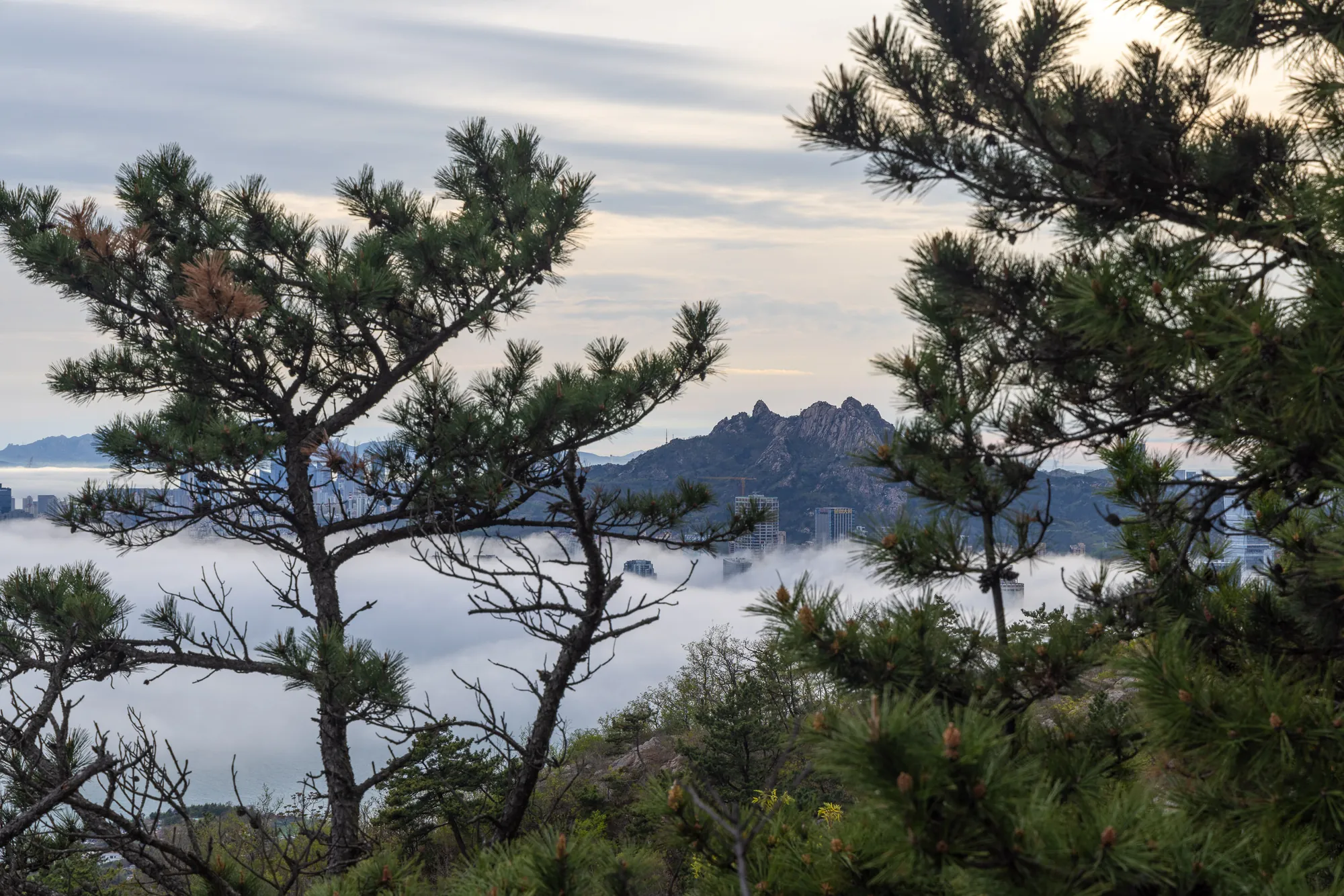 Back then, my girlfriend and I weren’t married. We were hiking a small hill at Shilaoren Sightseeing Garden, Qingdao. As we climbed, the fog gradually rose and drifted around us. By the time we reached the top and looked out, the lower parts of the city were already hidden in fog, with only the taller buildings breaking through. So I took this photo.
