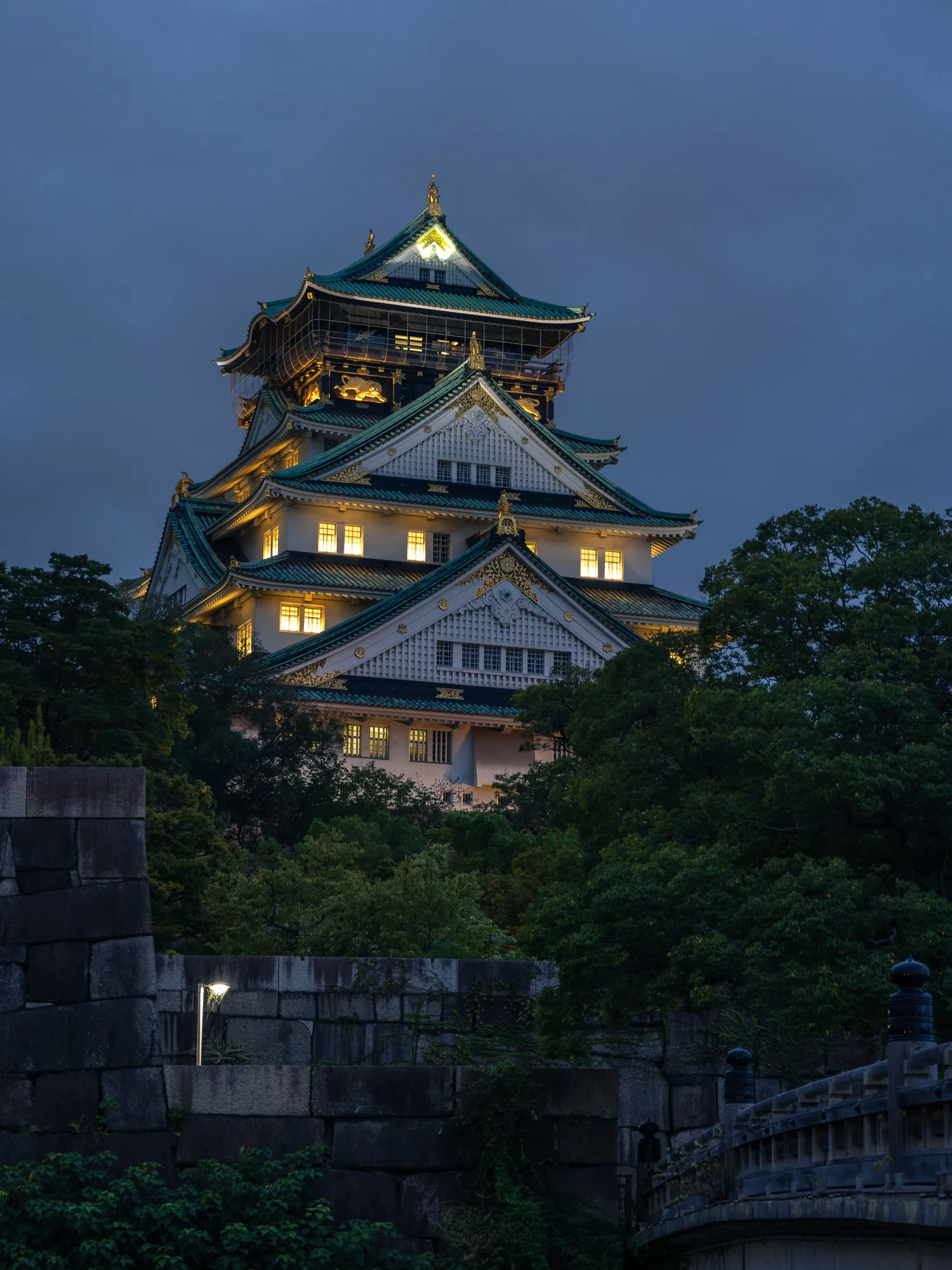 On the afternoon of the second day after arriving in Osaka, my wife and I walked through Osaka Castle Park. While resting on the north side and deciding where to eat, we suddenly realized the castle tower might be illuminated at night. So we waited a little longer, and sure enough, it lit up. That’s when I took this photo.