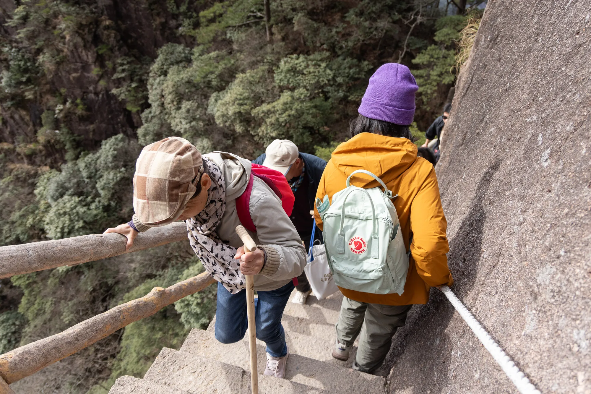 During the Qingming Festival, my wife and I went hiking on Mount Huangshan. The mountain has many dangerous and unavoidable paths, some of which are just a few steps built along the edge of steep cliffs.