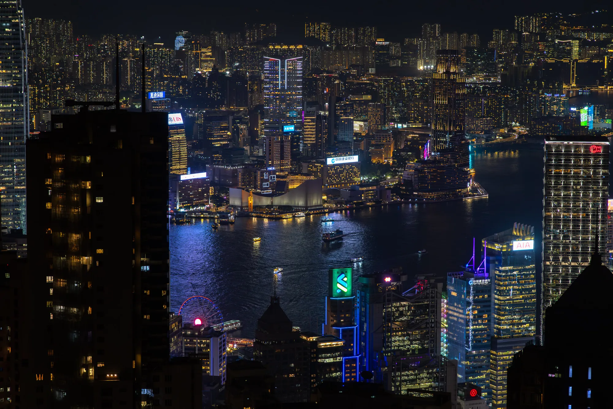In September my wife and I stayed in Hong Kong for three days. Because of a typhoon it rained for the first two days. Fortunately the weather cleared on the third day so we took the Peak Tram to the top of Victoria Peak. This is the magnificent night view of Victoria Harbour from the peak.