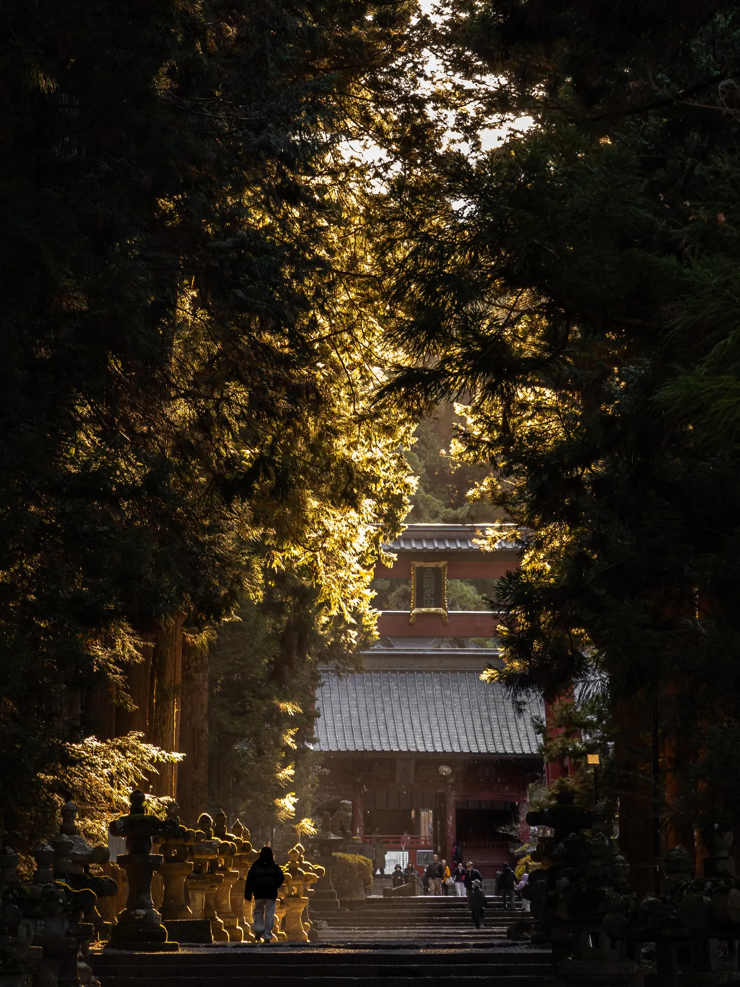On our trip to Japan in late 2025, my wife and I visited Kitaguchi Hongu Fuji Sengen Jinja at the foot of Mount Fuji. The shrine is surrounded by many towering trees, giving it a very peaceful and secluded feel. I captured this shot when looking back as we were leaving via the tree-lined path in front of the main gate. Even though it was only around 3 p.m., the way the trees shaded the sun had already given the scene a twilight-like quality.